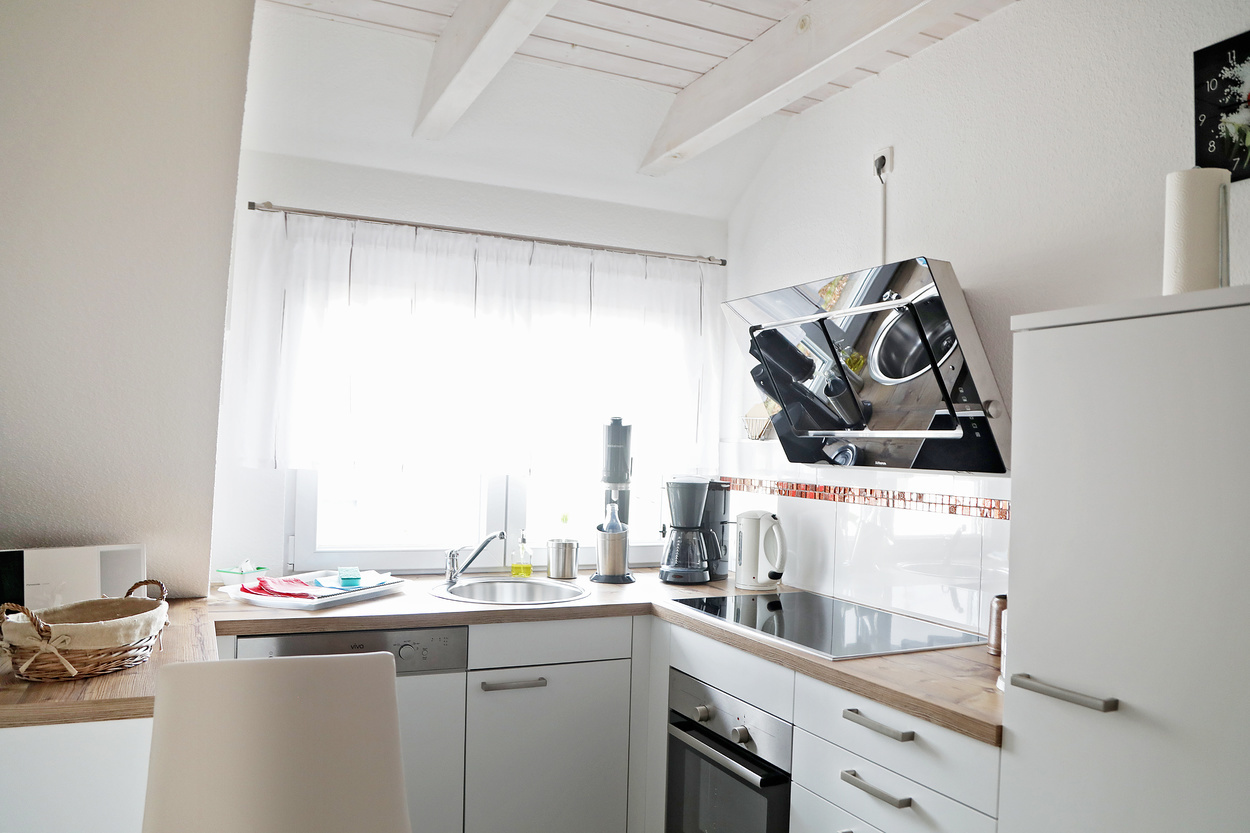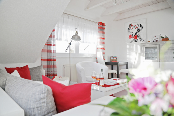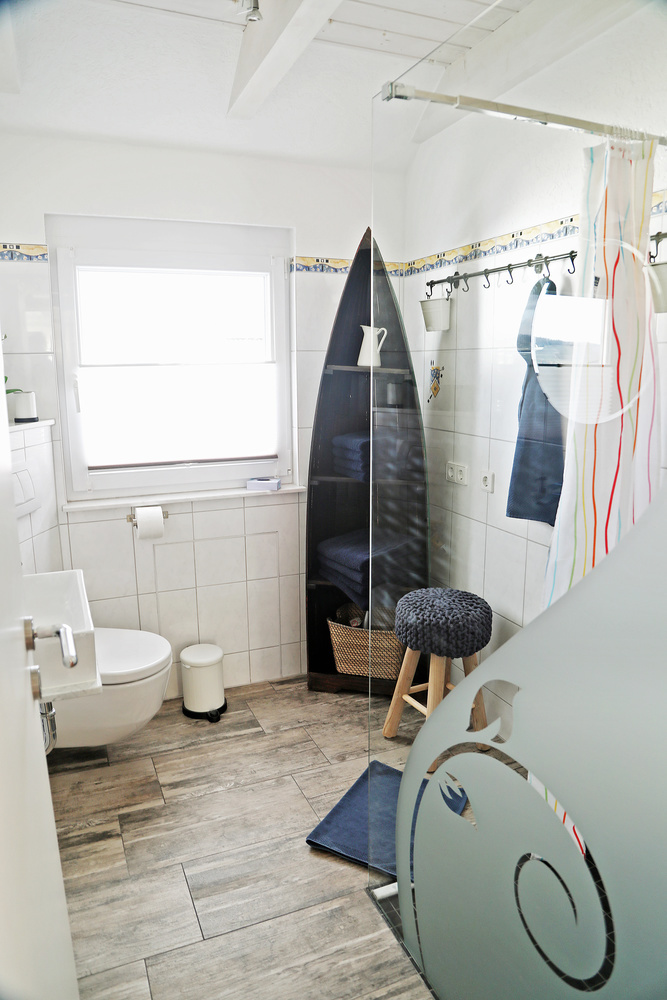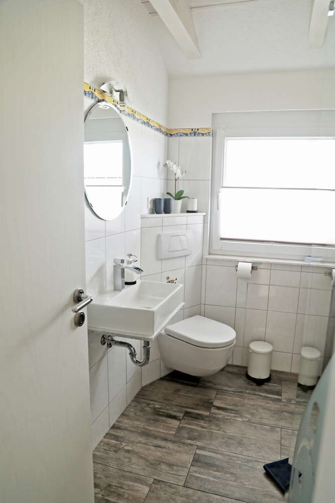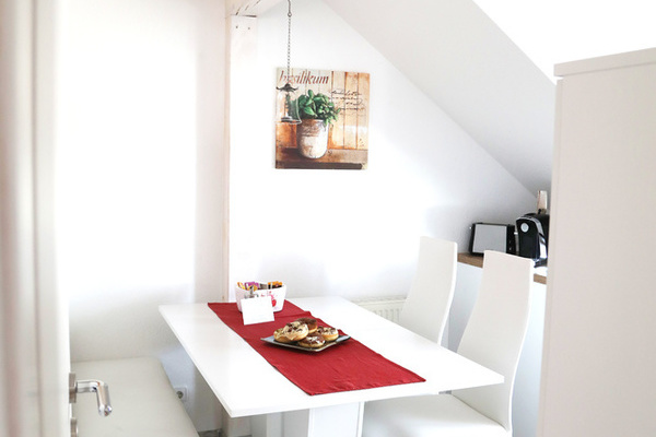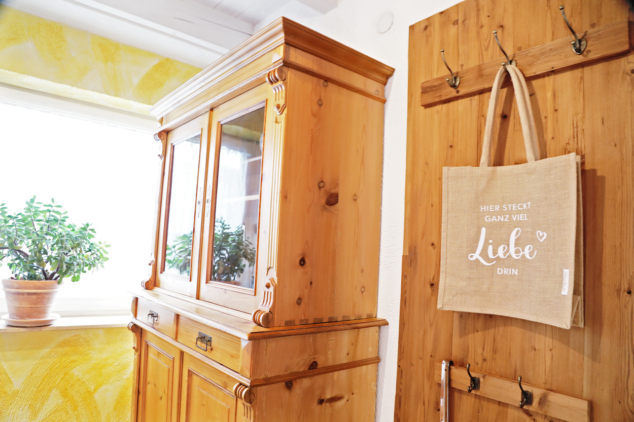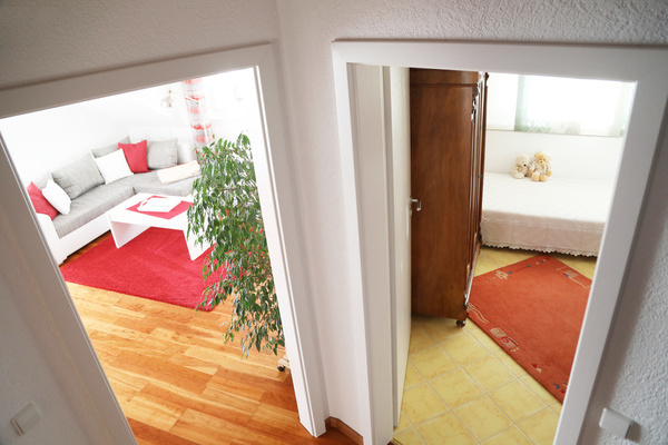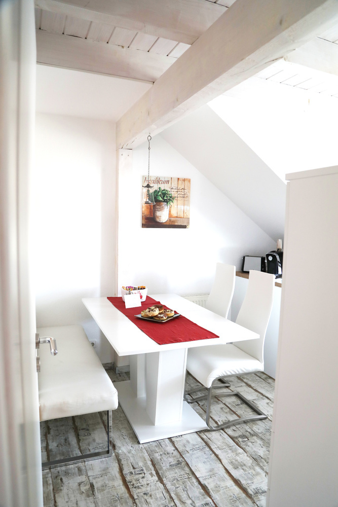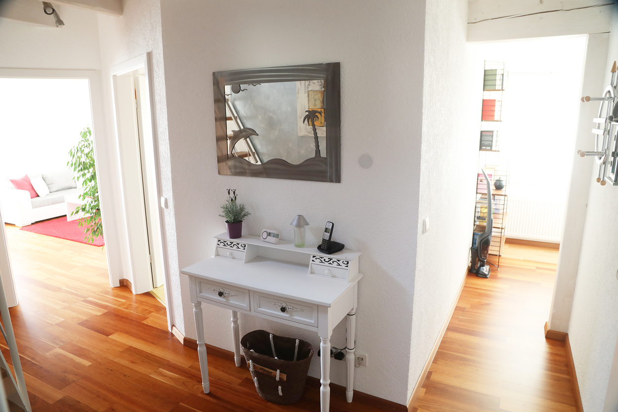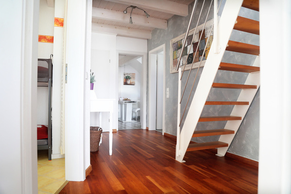 Die Ferienwohnung im 1. Obergeschoss ist modern und hell eingerichtet und bietet genug Raum für Familien mit Kindern. Die Ausstattung ist kinderfreundlich und verfügt über Beistellbett sowie Kinderhochstuhl etc.