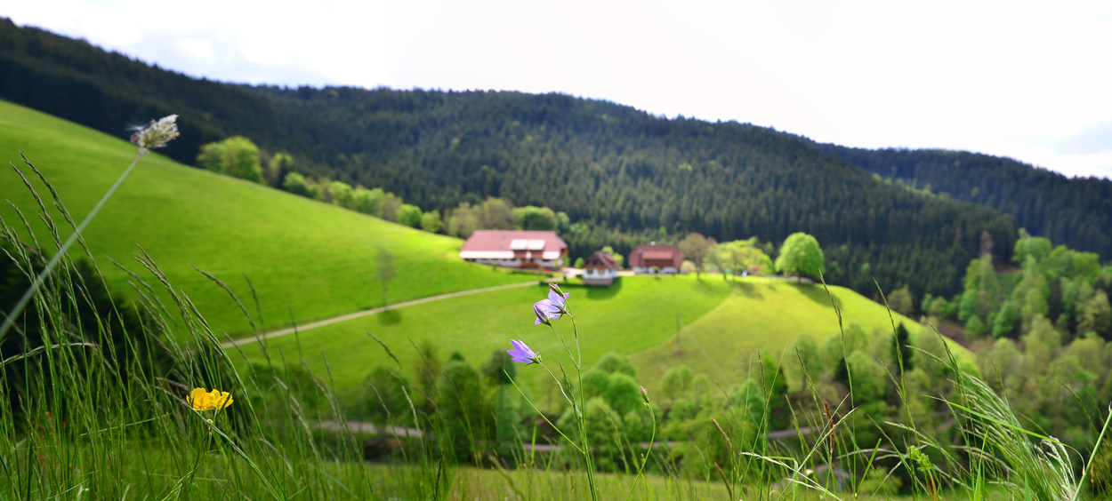 Typischer Schwarzwälder Einzelhof in einem idyllischen ruhigen Seitental, auf einer sonnigen Anhöhe liegend umgeben von Wiesen und Weiden, mit einem herrlichen Ausblick ins Tal und über die Wälder.
